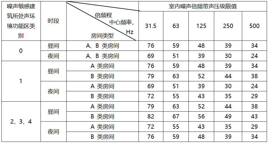 表3 结构传播固定设备室内噪声排放限值(倍频带声压级)                             单位: dB(A)
